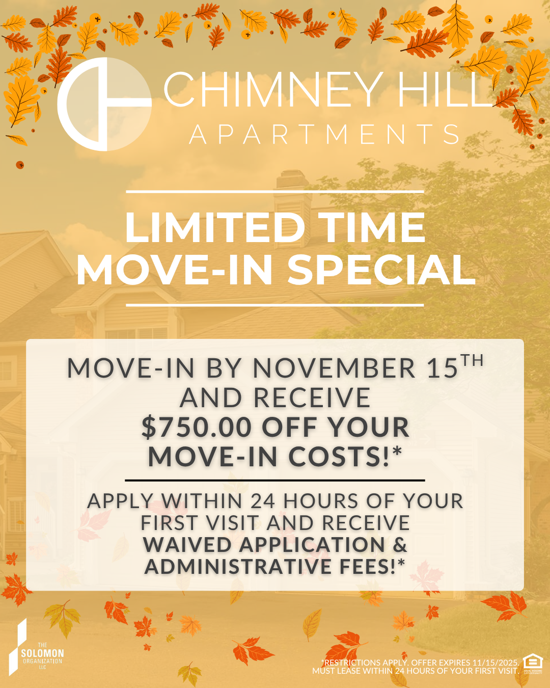 Move-In By November 15th and Receive $750.00 Off Move-In Costs!* Apply Within 24 Hours of Your First Visit and Receive Free Administration & Application Fees! *Restrictions Apply.