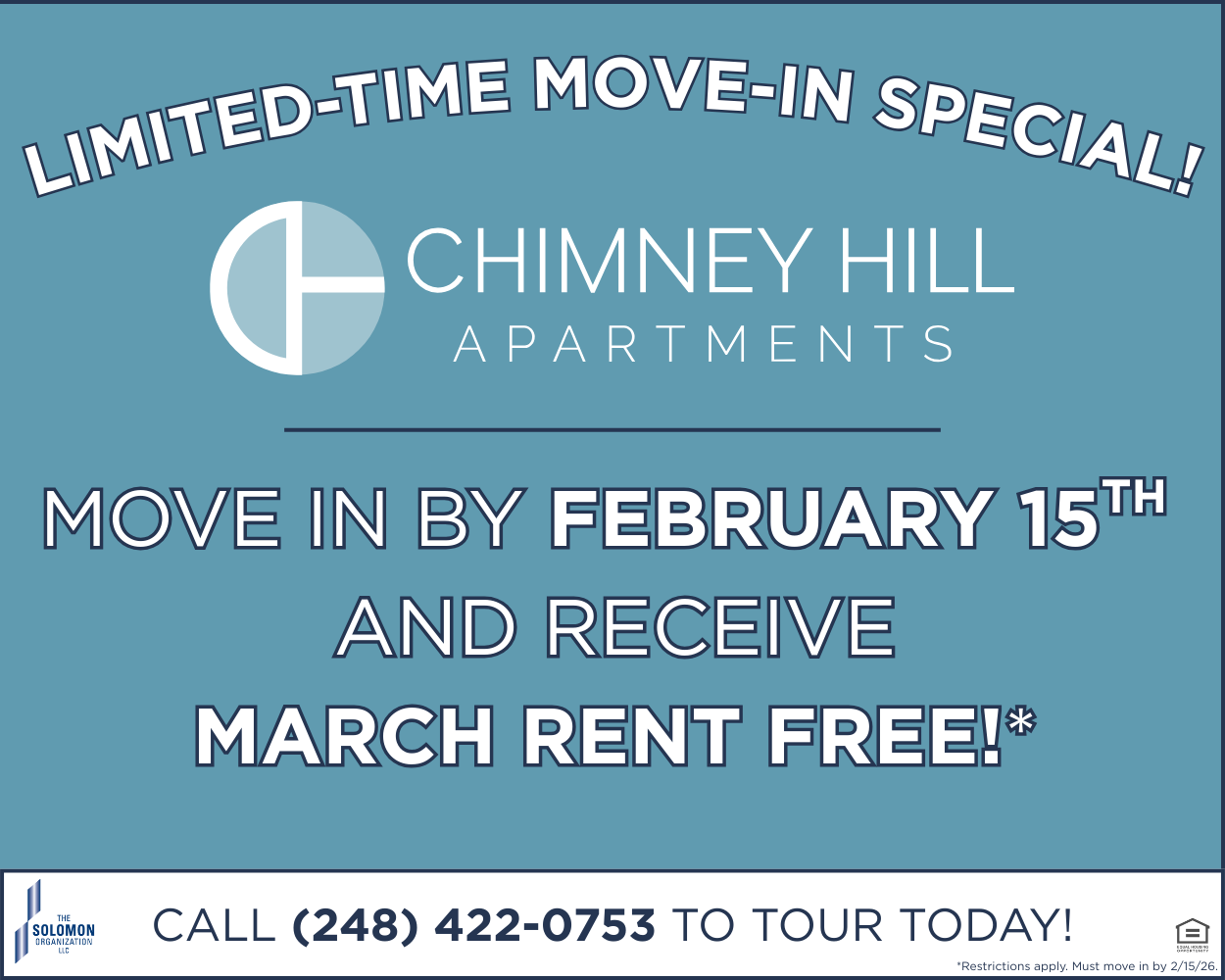 Move in by February 15 and receive March rent free at Chimney Hill Apartments. Call today to schedule your tour!